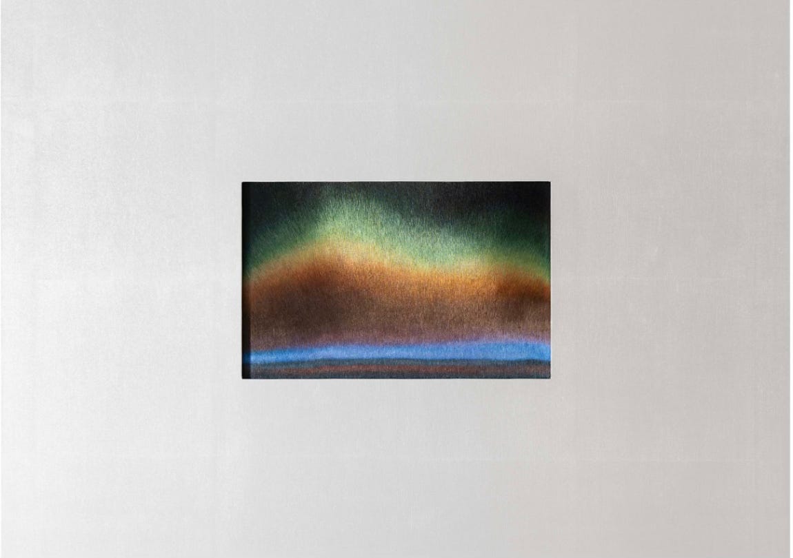 For as long as I live, I hope I never hear the expression “Painting is Dead!” as that is one of the most inane statements made about a medium whose practitioners are continually reinventing the wheel of painting, not just in appearance but also in its physical nature. Wang Ye (Chinese, b. 1991) is an artist who completely dismantles this notion that looking at painting entails observation from a sole vantage point (directly in front of the work). Studying Ye’s paintings feels more akin to the spatial relationship one forges with a sculpture as opposed to a two-dimensional object. Their practice is not conventional painting, the word does not even come up in the exhibition’s press release. There are no brushstrokes, no gestures, and no canvas support. Instead, Ye’s work is a literal threading of handmade silk embroidery that produce magnificent compositions of rhythmic patterns, dazzling lights, and piquant coloration; these attributes are subject to change based on the angle from which you stand as the lighting and shades alter as you change your angle, be it a shift from left to right or looking more askance than frontally. This is painting without painting.