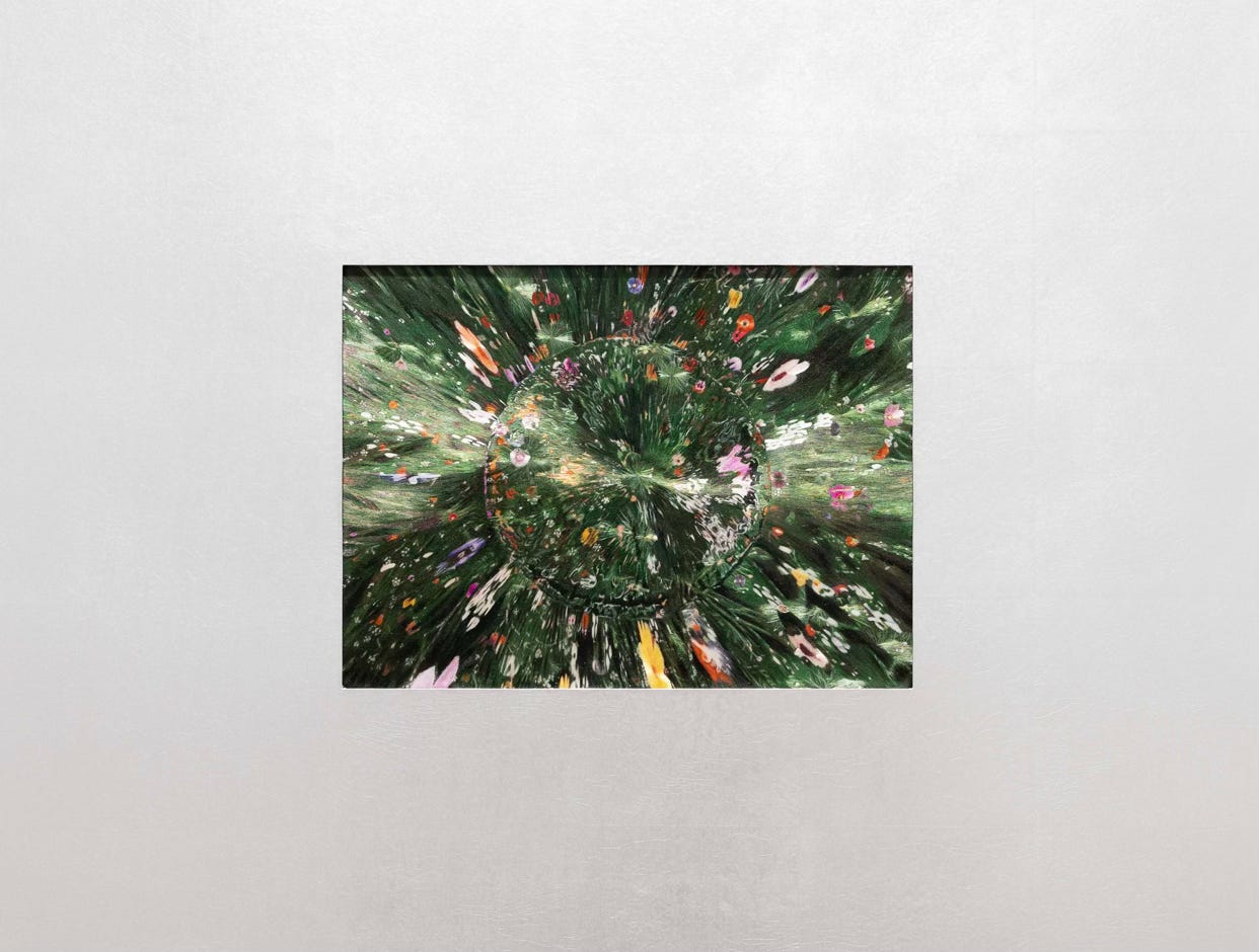 Everything Daisy (2025) takes a radically different approach to sight as the image feels like we are seeing a bed of flowers through the perspective of a mid-fall water droplet denoted in the central circle surrounded by a stretched view of suggested grass blades and floral buds.