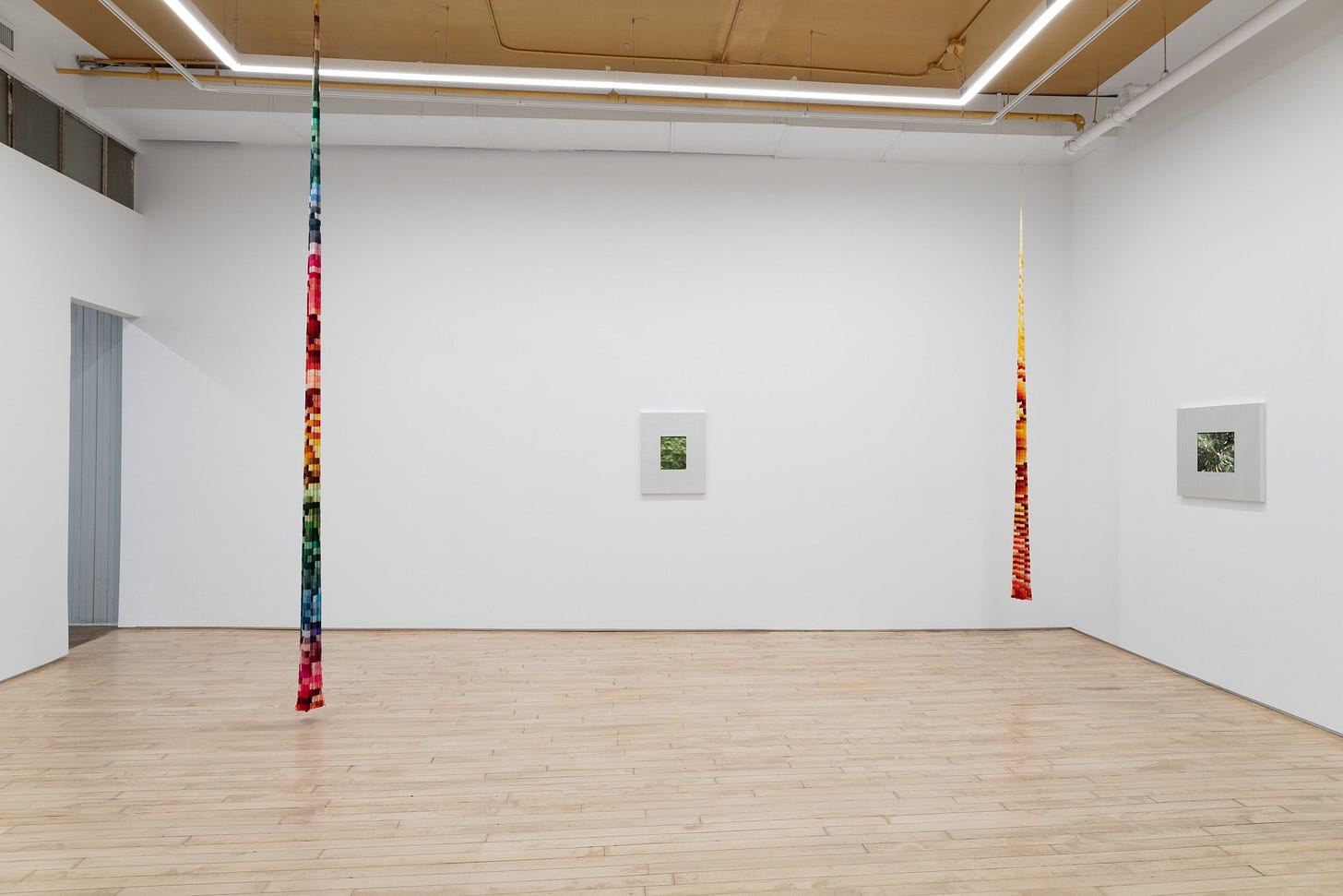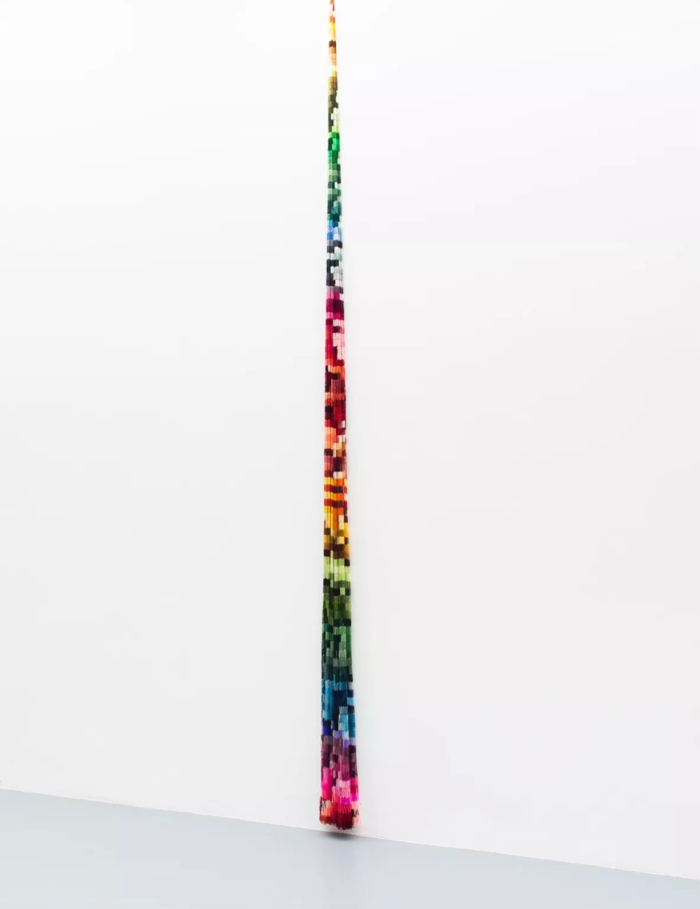 In conjunction with these framed works, there were epic columns of color, also created entirely from silk threads, hung from floor-to-ceiling. Much like an elaborate quilt design, a multitudinous patchwork of shades felt like a vertically-oriented rainbow that takes a top-bottom / bottom-top approach to understanding color theory.