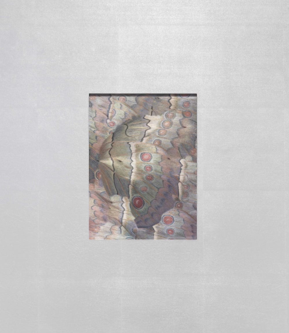 All of the painting-esque works are held in wide silver artist frames, often encompassing more square inches of space than the actual image contained within. The importance of frames and how they affect an artwork’s appearance remains a grossly overlooked topic, and Ye’s exhibition is an excellent case for how you cannot just use any frame to surround a piece. Given the transformative light-color changes that occur dependent on the atmospheric conditions of the works in situ along with that of the viewer’s physical relationship to them, the silver frames, too, wield an integral role in the absorption, reflection, and refraction of luminescence and coloration. If there were no frames or a much thinner frame around these works, I think Ye’s images would not have even remotely attained the same degree of visual zhuzh that I was able to appreciate.
