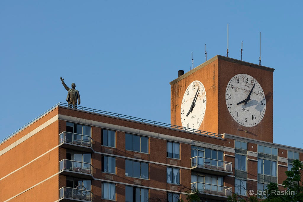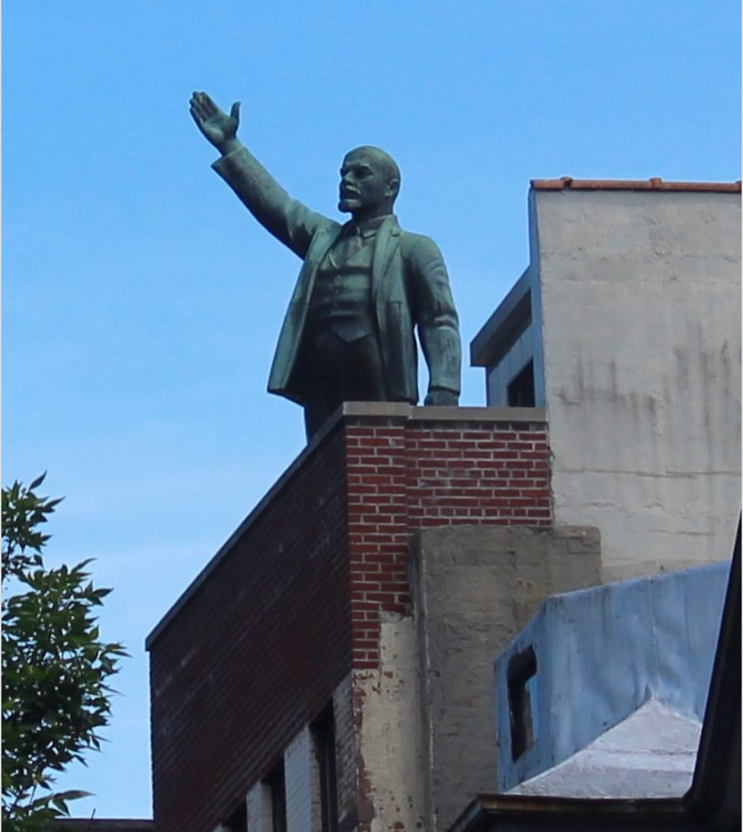 An 18-foot tall bronze statue of the Russian revolutionary Vladimir Lenin hovers over the edge of an unassuming brick apartment building in New York’s Lower East Side. This sculpture was originally created in 1982 sometime in the final months of Leonid Brezhnev’s term as head of the USSR and just a few years before Gorbachev’s implementation of perestroika (political & economic reform). Upon the dissolution of the USSR in 1989, the statue fell out of favor with Russia’s changed political climate. Concurrently, the American property developers Michael Rosen and Michael Shaoul were in Moscow and happened upon the statue discarded in a backyard on the outskirts of the capital. Coincidentally, the pair had established an apartment building in New York’s East Village that same year, the aptly titled Red Square. This sculptural find proved to be the ideal marker of the newly opened apartment building. And so, the sculpture was brought back to the United States and was eventually installed on the Red Square rooftop in 1994 as a symbol of the longstanding political spirit of the neighborhood. However, a real estate conglomerate purchased Red Square in 2016, to which Rosen and Shaoul removed the Lenin statue out of concern that the new owners would discard it. The story was the subject of much media attention that came to a close in Fall 2016 when the Lenin statue was finally installed on the roof of 178 Norfolk Street where it stands today.